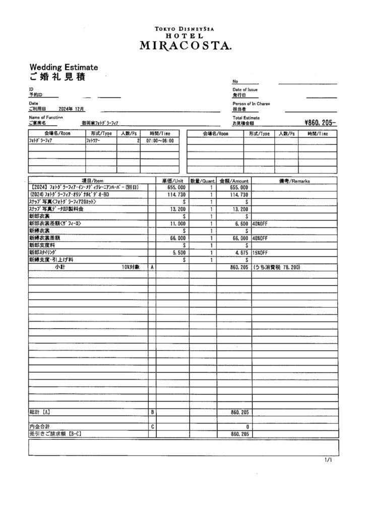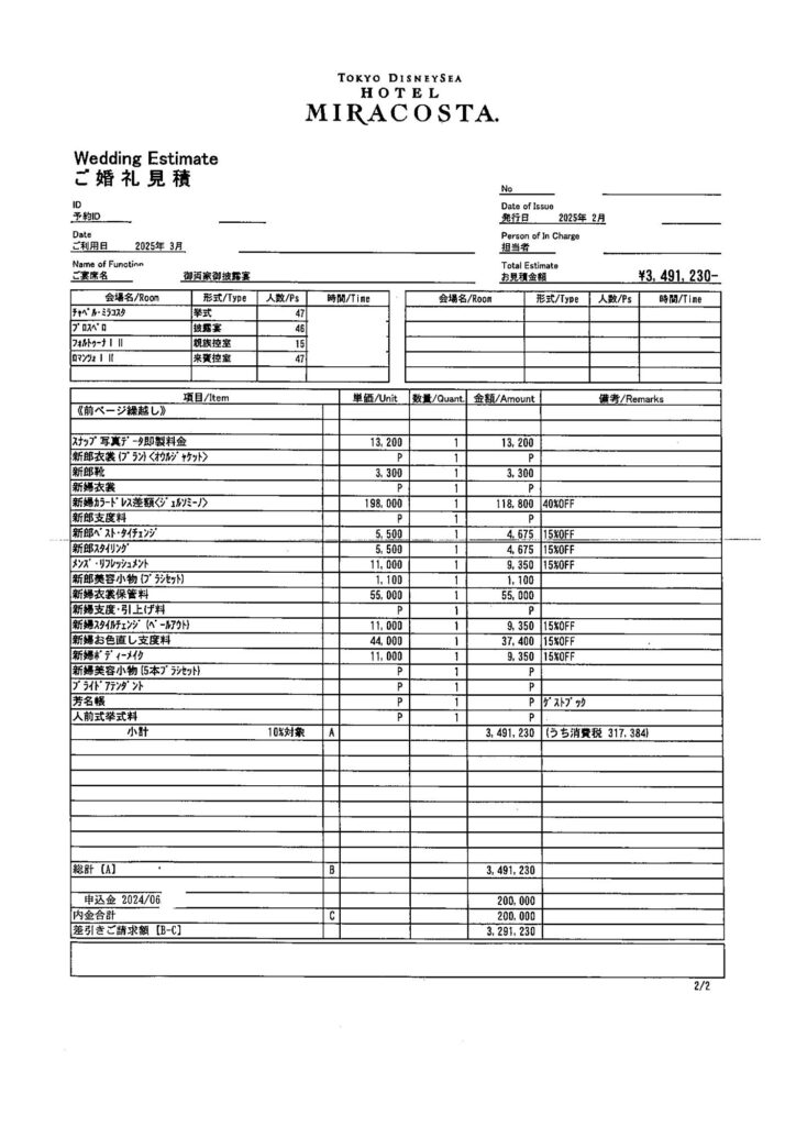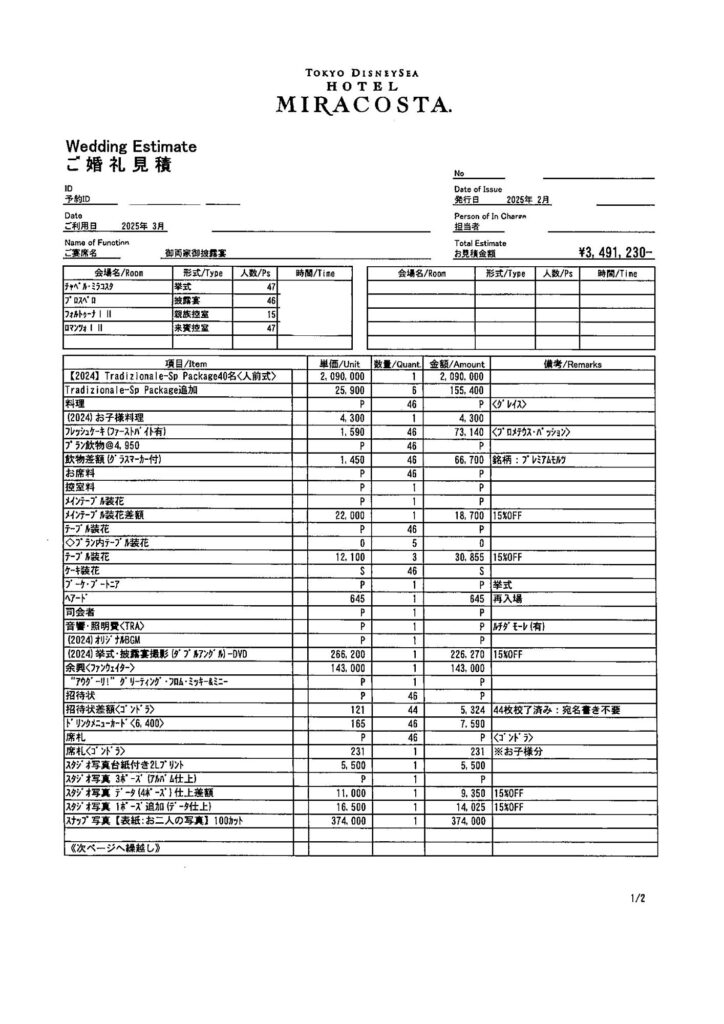 結婚式費用のうち、ホテルミラコスタに支払った金額が今回の見積もりに載っている金額です。